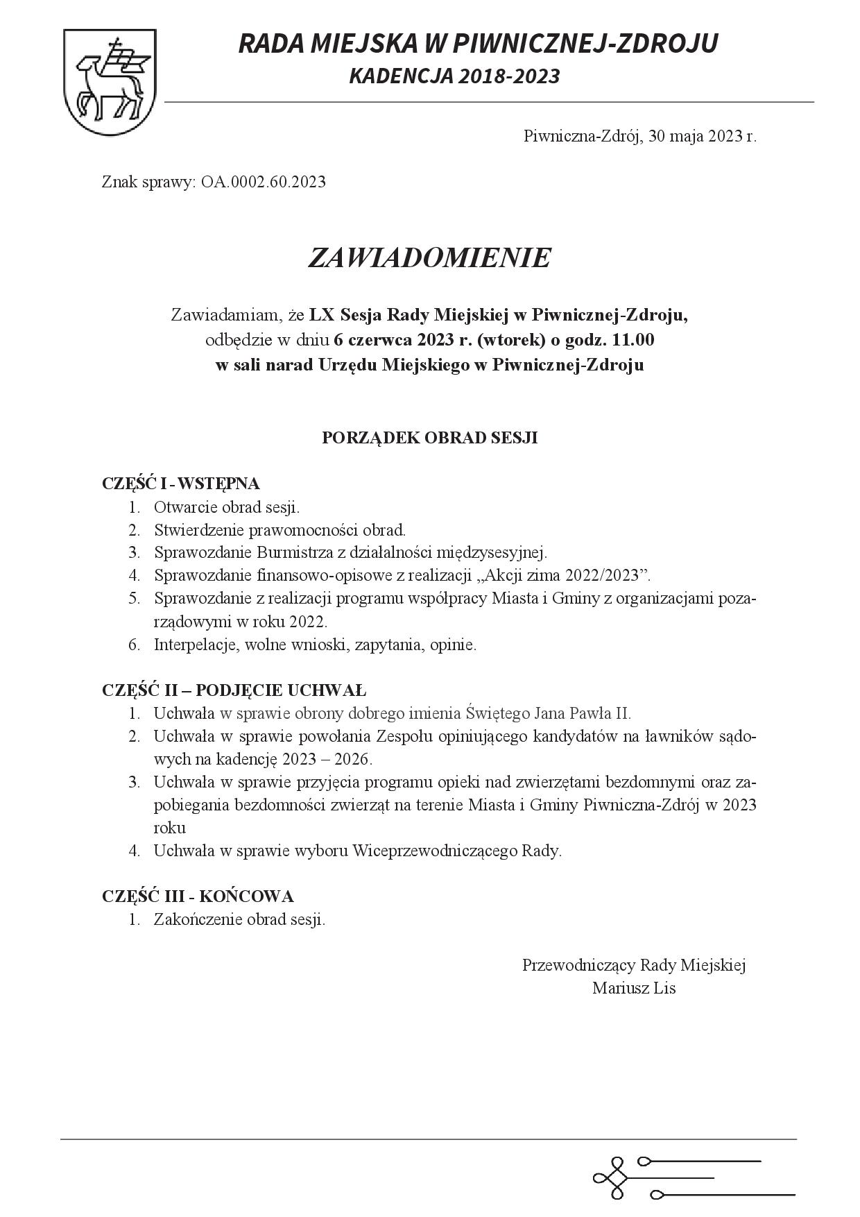 - Porządek obrad LX Sesja Rady Miejskiej w Piwnicznej-Zdroju 06.06.2023 r. (wtorek) - AKTUALIZACJA