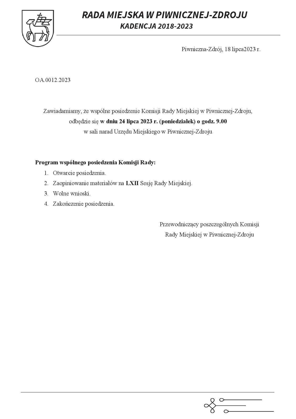ZAWIADOMIENIE: LXII Sesja Rady Miejskiej w Piwnicznej-Zdroju 25.07.2023 r. (wtorek)