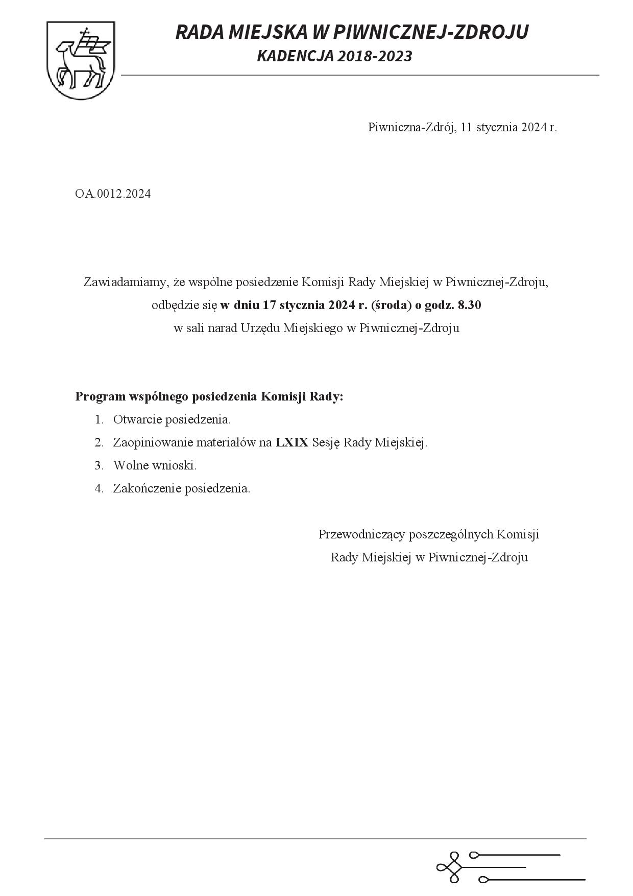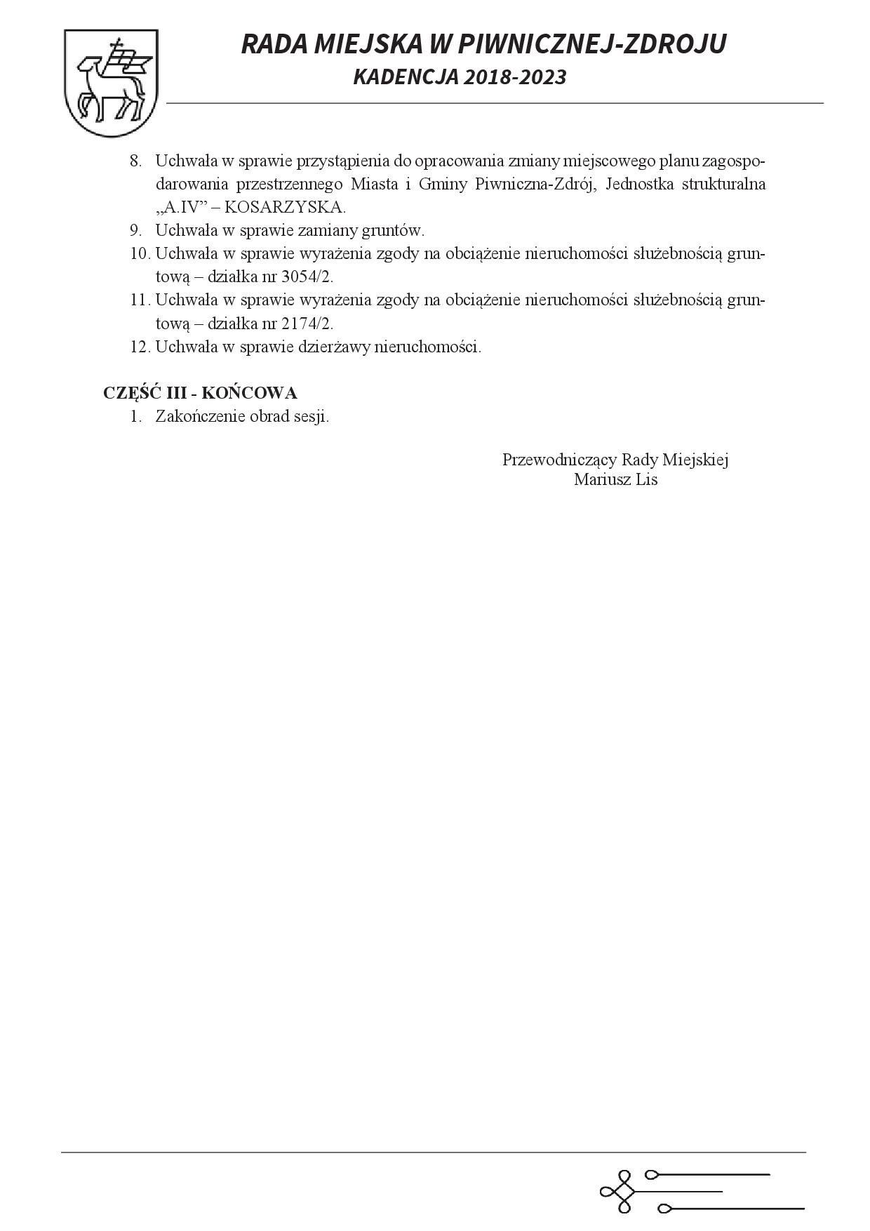 - PORZĄDEK OBRAD SESJI LXIX Sesja Rady Miejskiej w Piwnicznej-Zdroju 22.01.2024 r.
