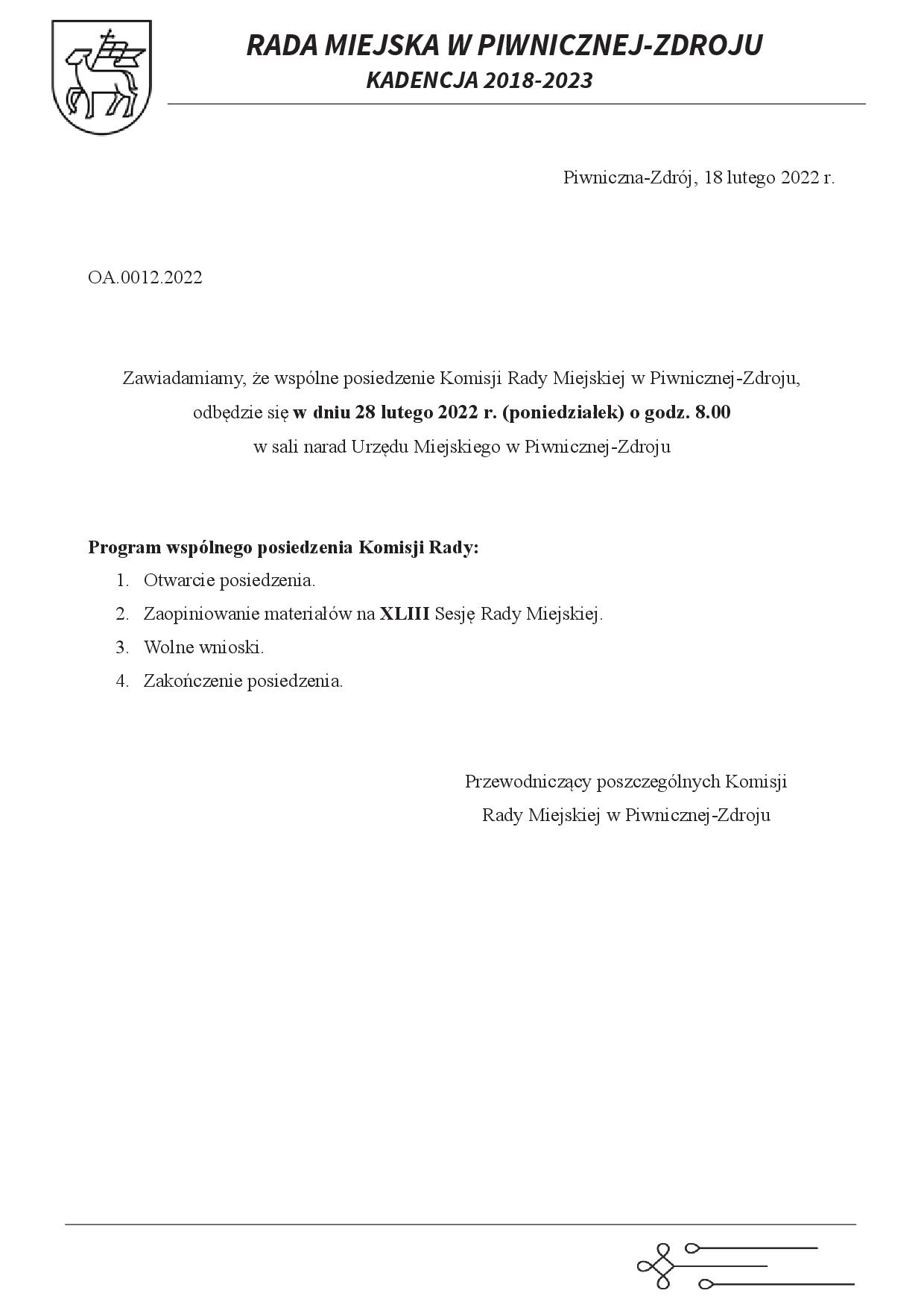 ZAWIADOMIENIE: XLIII Sesja Rady Miejskiej w Piwnicznej-Zdroju 28.02.2022 r.
