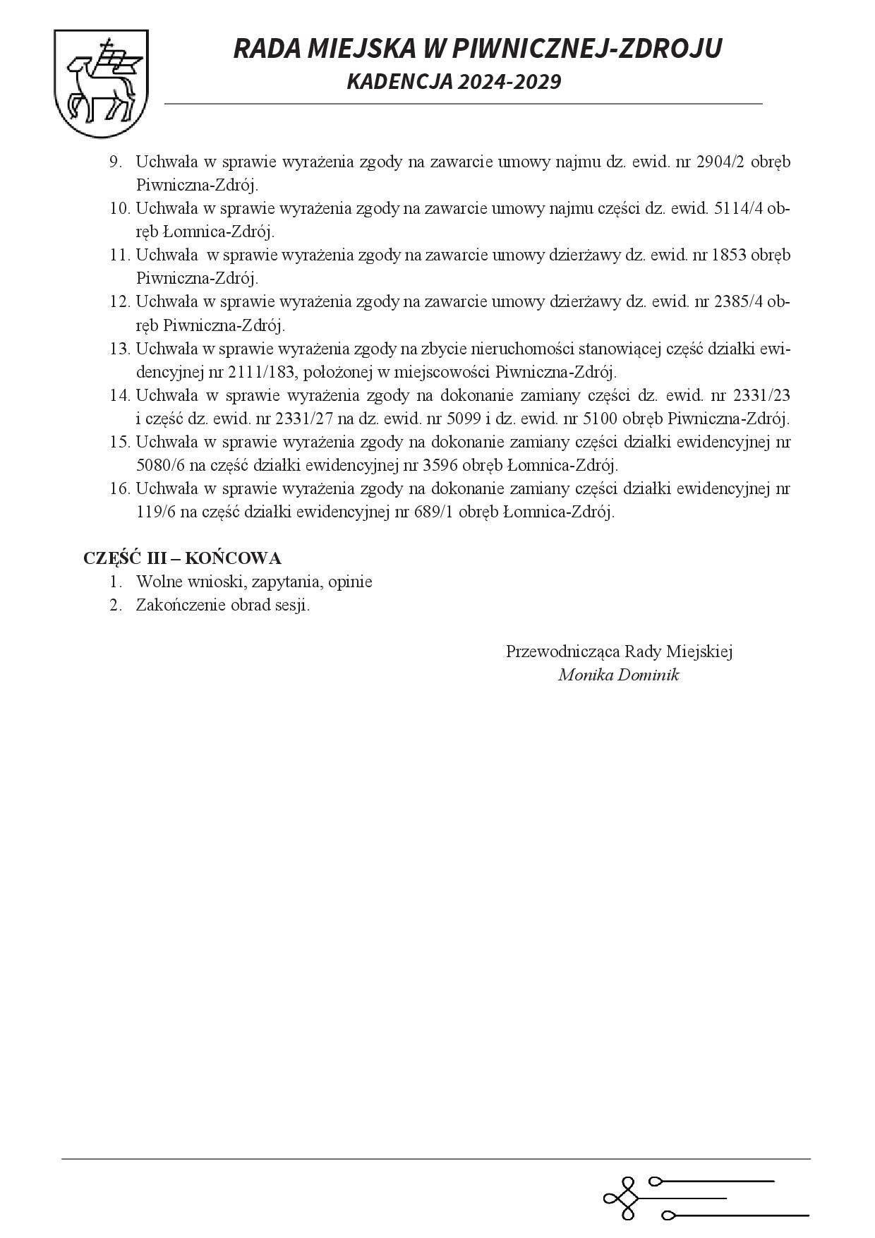 - 13.Uchwała w sprawie wyrażenia zgody na zbycie nieruchomości stanowiącej część działki ewidencyjnej nr 2111/183, położonej w miejscowości Piwniczna-Zdrój.