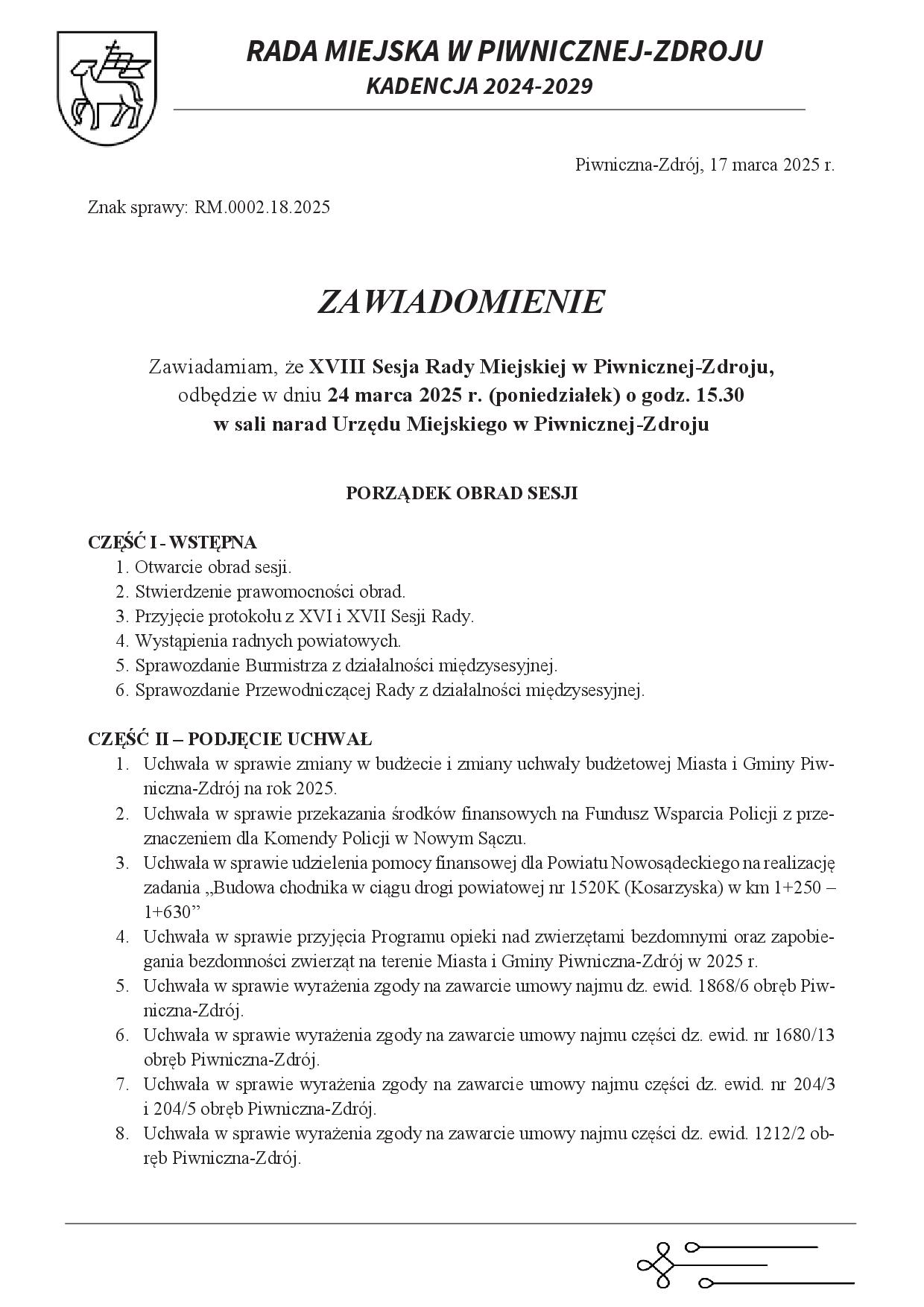 - PORZĄDEK OBRAD XVIII Sesja Rady Miejskiej w Piwnicznej-Zdroju odbędzie się w dniu 24.03.2025 r. (poniedziałek) godz. 15:30