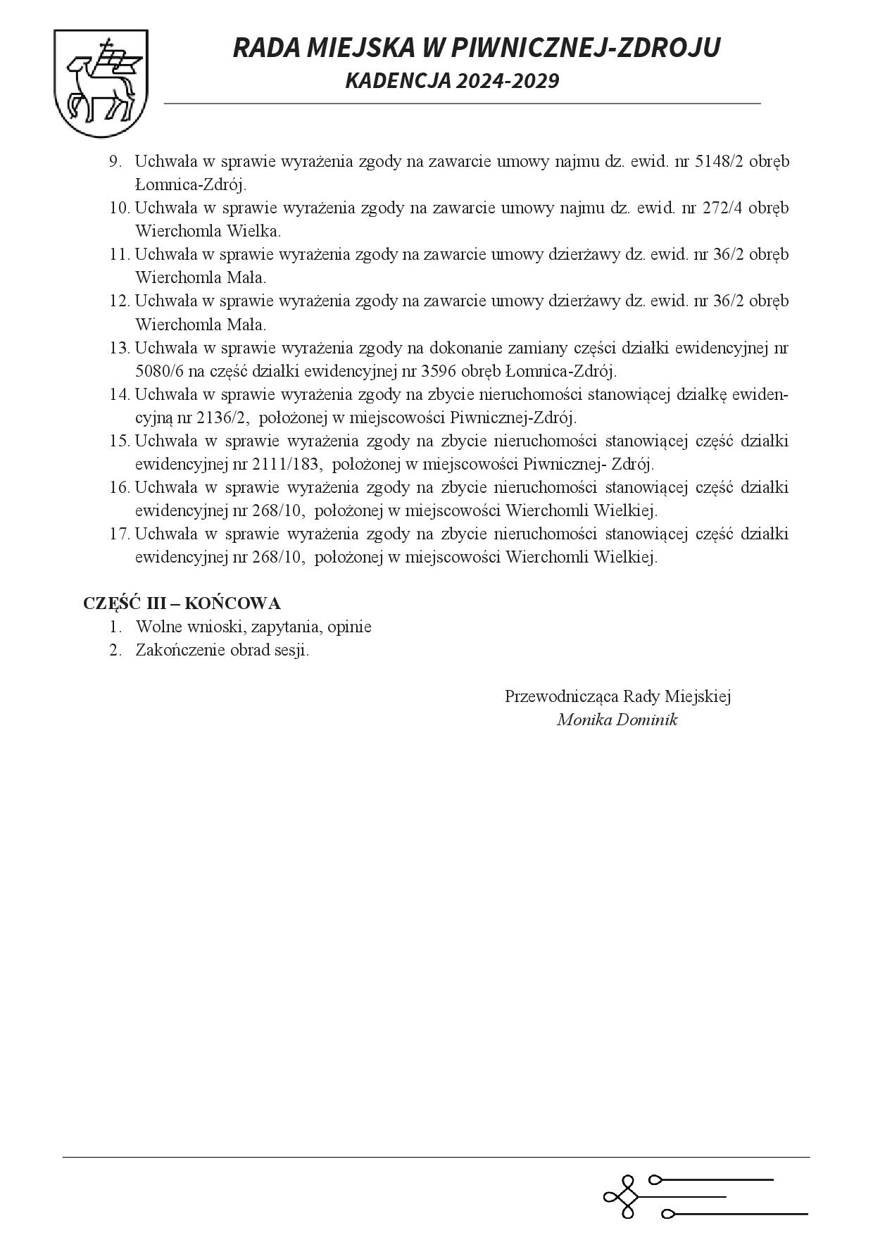 - 17. Uchwała w sprawie wyrażenia zgody na zbycie nieruchomości stanowiącej część działki ewidencyjnej nr 268/10, położonej w miejscowości Wierchomli Wielkiej.