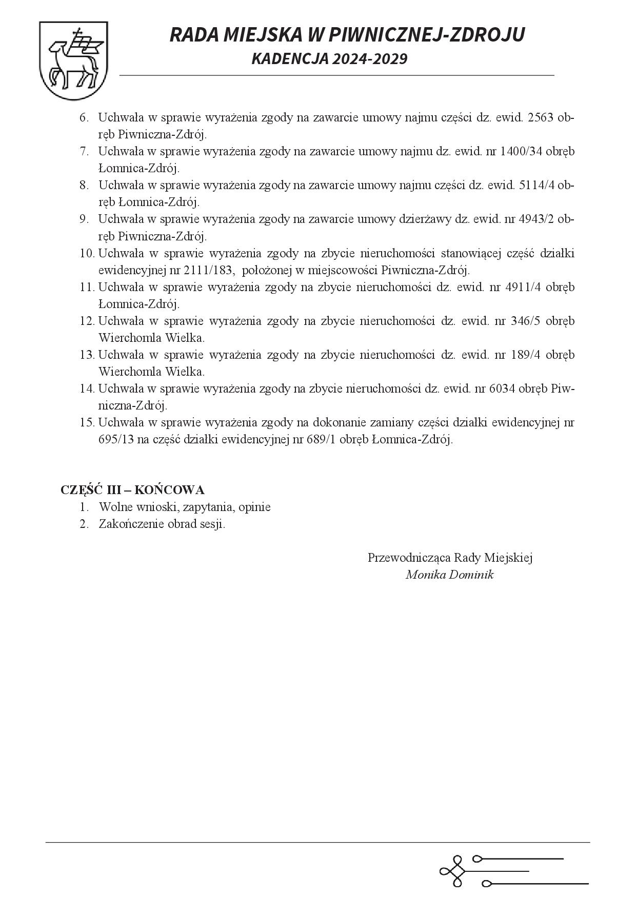 - 6. Uchwała w sprawie wyrażenia zgody na zawarcie umowy najmu części dz. ewid. 2563 obręb Piwniczna-Zdrój.