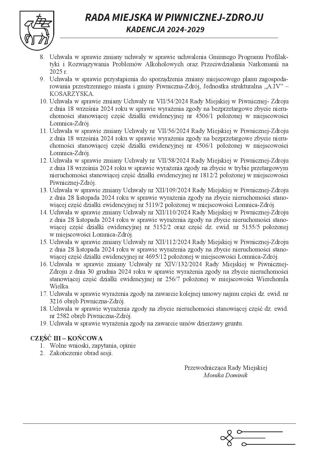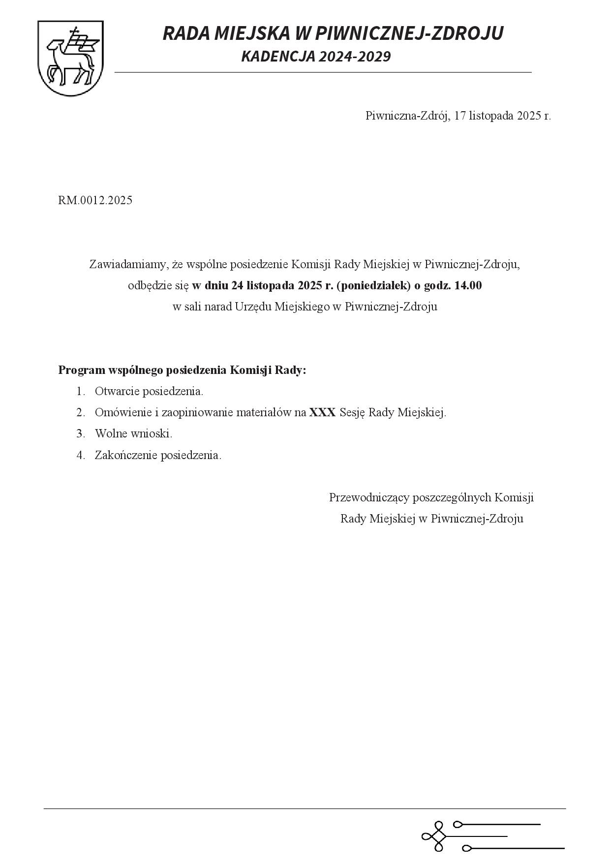 - PORZĄDEK OBRAD XXX Sesja Rady Miejskiej w Piwnicznej-Zdroju 24.11.2025 r. o godz. 16:00 (poniedziałek)
