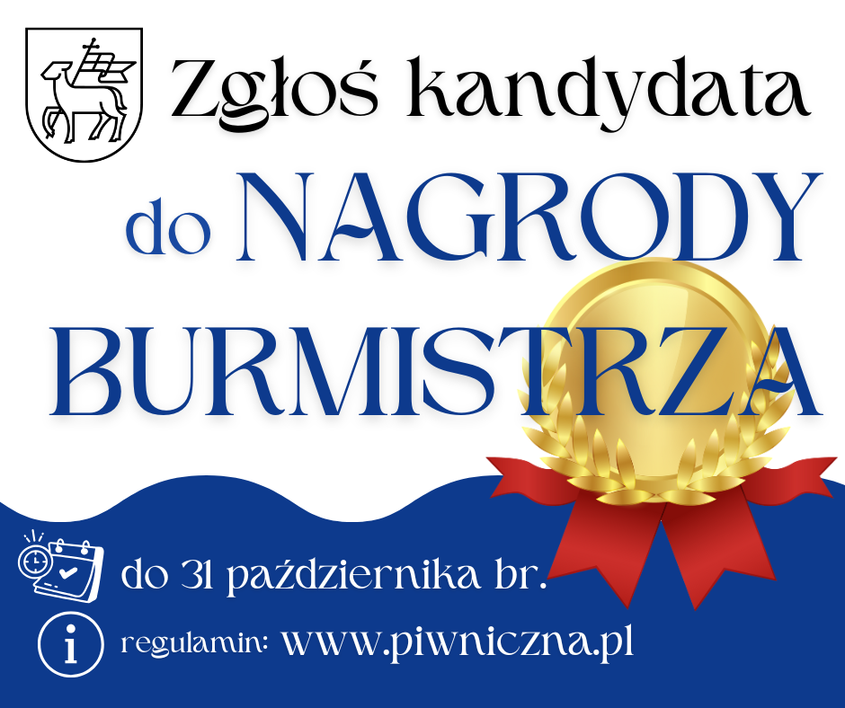 Burmistrz Piwnicznej-Zdroju informuje o możliwości składania wniosków o przyznanie "Nagrody Burmistrza Miasta i Gminy Piwniczna-Zdrój" w kategoriach osiągnięcia naukowe, osiągnięcia sportowe, osiągnięcia kulturalne, młody przedsiębiorca. Wnioski można składać w terminie do 31 października 2025 r. w sekretariacie Urzędu Miejskiego w Piwnicznej-Zdroju pok. 15. Regulamin przyznawania oraz wzory dokumentów do pobrania poniżej.